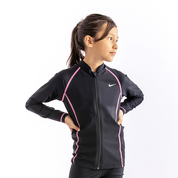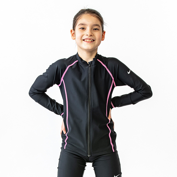 ナイキ NIKE スクール ロングスリーブ ラッシュガード GIRLS ブラック/アトミックパンチ 140cm SP22 F/Z UV ジッパー式 水着 スクール水着 女子