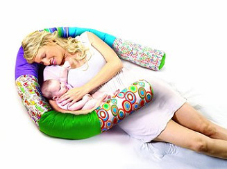 クロワッサン型のへこみの部分をお母さんのお腹にはめて、赤ちゃんをクッションの上に寝かしながら授乳します。