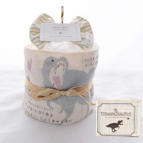 イメージ拡大 イメージ拡大 おむつケーキ リヤンドファミーユ 恐竜絵本タオルのベビーケーキ ティラノサウルスのひみつ 出産祝い 女の子 男の子 おむつ オーガニック コットン くすみカラー おしゃれ プレゼント ギフト タオル