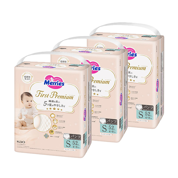 イメージ拡大 イメージ拡大 メリーズ パンツ ファーストプレミアム パンツ Sサイズ 4kg 〜 8kg 156枚 (52枚×3袋) パンツタイプ 花王 Merries 紙おむつ 紙オムツ プレミアム カシミヤタッチ ふんわり さらさら