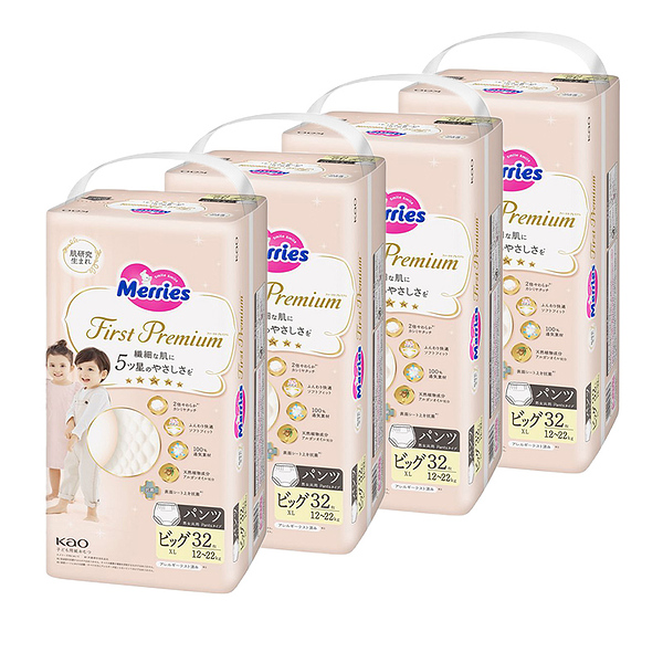 イメージ拡大 イメージ拡大 メリーズ パンツ ファーストプレミアム パンツ BIGサイズ 12kg 〜 22kg 128枚 (32枚×4袋) ビッグ XL パンツタイプ 花王 Merries 紙おむつ 紙オムツ プレミアム カシミヤタッチ ふんわり さらさら