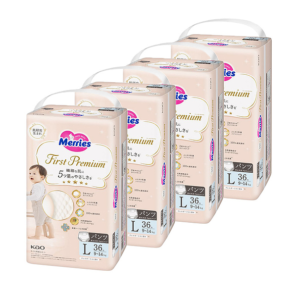 イメージ拡大 イメージ拡大 メリーズ パンツ ファーストプレミアム パンツ Lサイズ 9kg 〜 14kg 144枚 (36枚×4袋) パンツタイプ 花王 Merries 紙おむつ 紙オムツ プレミアム カシミヤタッチ ふんわり さらさら