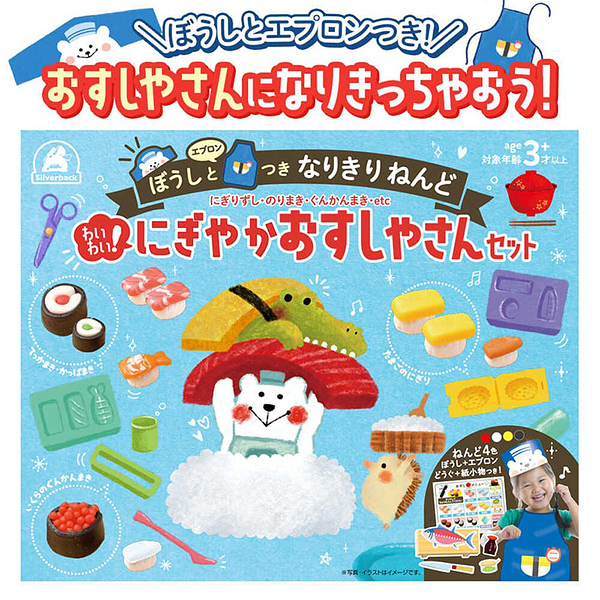 イメージ拡大 イメージ拡大 シルバーパック ぼうしとエプロンつきなりきりねんど【わいわい!にぎやかおすしやさんセット】 ねんどセット 知育玩具 粘土 こむぎねんど 小麦粘土 ねんど型 遊び 誕生日 プレゼント 幼稚園 お祝い