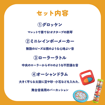 ■セット内容:ミニレインボーメーカー×1、オーシャンドラム×1、グロッケン×1、ローラーラトル×1