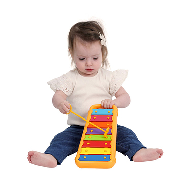 マレットで奏でる1オクターブの鉄琴。ドレミやメロディーに親しむころまで使えます。鍵盤と同じ色の音符で書かれた楽譜付き。