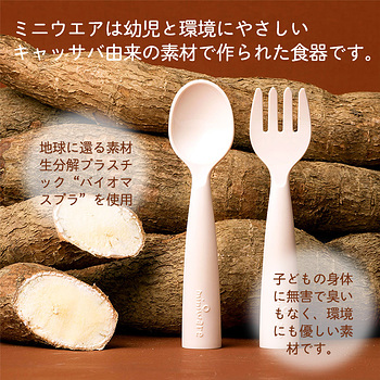 ミニウェアは、キャッサバのデンプンに含まれる乳酸を原料とした“ポリ乳酸”を使用。