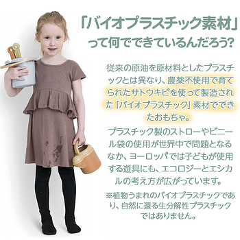 従来の原油を原材料としたプラスチックとは異なり、農薬不使用で育てられたサトウキビを使って製造された「バイオプラスチック」素材でできたおもちゃ。