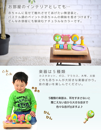 楽器はカスタネット、ギロ、マラカス、木琴、太鼓の5種類。それぞれ持ち手部分には滑り止めリングがついており、本体にプリントされたリングの色と色合わせをしてお片づけもできます。