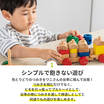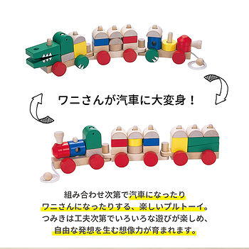 ワニさんのボディーが積み木になったかわいいおもちゃです。積み方を変えるとワニさんが汽車に大変身します。ヒモを引っ張ってプルトーイとしても遊ぶことも出来ます。
