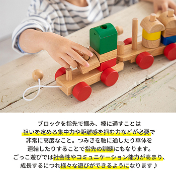 またつみきを積むだけでなく、台車の棒につみきを通すことで細かな指先の動きを促します。