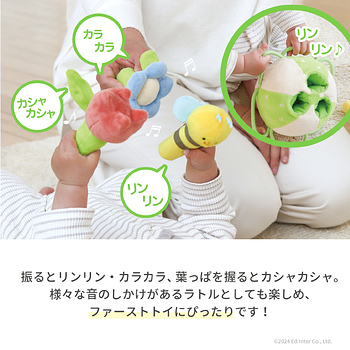 リンリン、カシャカシャ!すべてのパーツに音のしかけがあるので握ったり転がしたりしてラトルとしても楽しめます。