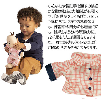 小さな袖や襟に手を通すのは細かな指の動きと力加減が必要です。「お世話をしてあげたい」という気持ちは、リトル・ベビーステラのお着替えも、練習中の自分のお着替えにも、挑戦しようという原動力に。お洋服をたたむ練習にもなります。お洋服やお世話グッズをそろえれば、想像の世界がさらに広がります。