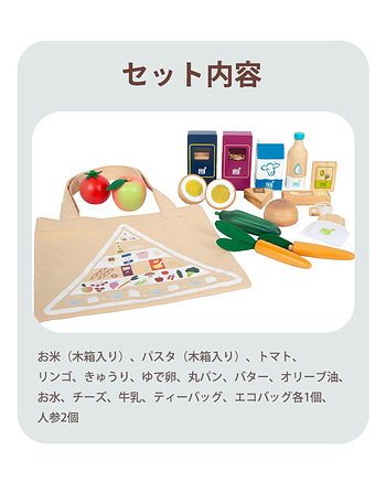■セット内容:お米(木箱入り)、パスタ(木箱入り)、トマト、リンゴ、きゅうり、ゆで卵、丸パン、バター、オリーブ油、お水、チーズ、牛乳、ティーバッグ、エコバッグ各1個、人参2個